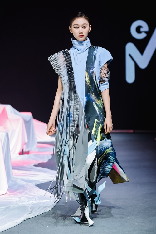 "未"作為生長容器核心理念貫穿全場,舞臺通過非對稱幾何結(jié)構(gòu)與參數(shù)化燈光系統(tǒng),創(chuàng)造出虛實交織的場域。冷調(diào)藍白光效中懸浮的立體剪裁作品,與黑色篇章里剛?cè)岵臋C能風設(shè)計形成戲劇張力,在低飽和度暖光中定格為開放式的未完成狀態(tài),完整呈現(xiàn)"從解構(gòu)到重構(gòu)"的設(shè)計哲學。