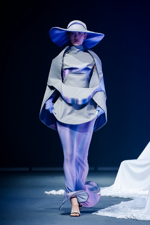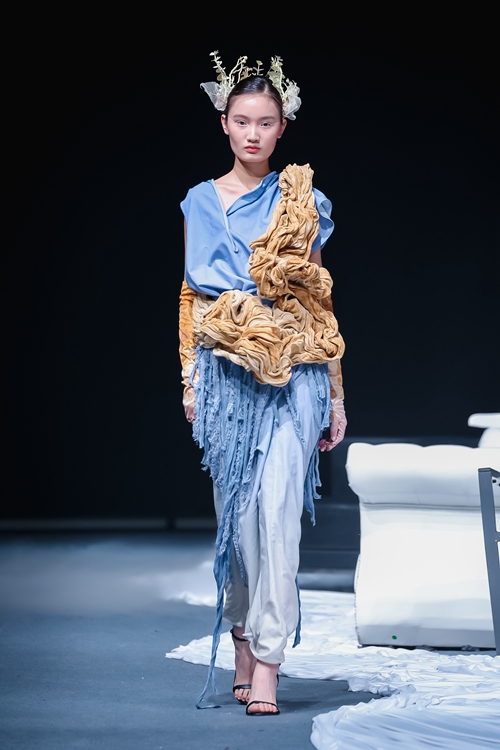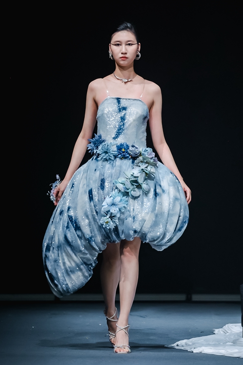 以藍白極簡主義開篇,設(shè)計師通過水溶刺繡工藝解構(gòu)傳統(tǒng)漢服交領(lǐng),將東方形制轉(zhuǎn)化為當代建筑感廓形,冷調(diào)光線中浮動的絲質(zhì)面料折射出新生代的審美覺醒。