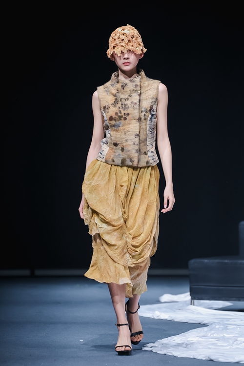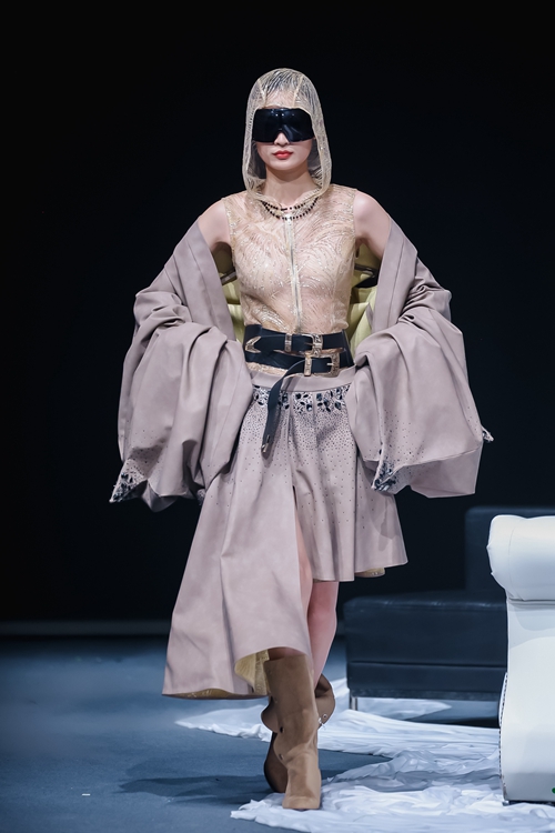 本場秀匯聚52位青年設(shè)計師的120套作品,通過模糊傳統(tǒng)與現(xiàn)代的邊界,構(gòu)建出時間感懸置的沉浸式空間。舞臺中央層疊的輕紗裝置隨漸變光線流轉(zhuǎn),從冷白、深黑到暖黃的光色演變,隱喻著從文化覺醒到未來探索的四重敘事。北服時裝周組委會特別設(shè)置產(chǎn)教融合簽約環(huán)節(jié),十余家企業(yè)現(xiàn)場與畢業(yè)生達成合作意向,彰顯作品的藝術(shù)價值與產(chǎn)業(yè)潛力。本場秀演均由時尚傳播學院表演專業(yè)學生進行演繹并參與編導(dǎo)。
