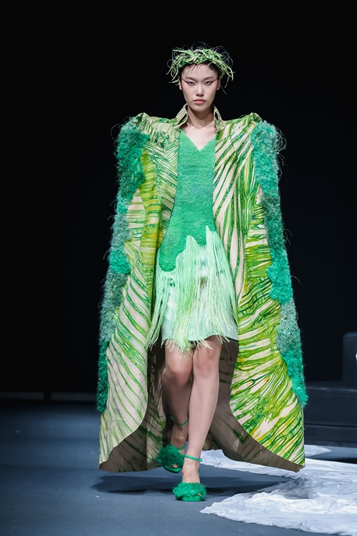 終章以參數(shù)化印花與生物基材質(zhì)的創(chuàng)新組合收尾,漸變光效中流動的數(shù)字化紋樣,與植物染工藝的精準色彩控制形成技術(shù)對話,構(gòu)建出開放式的未來時尚圖景。