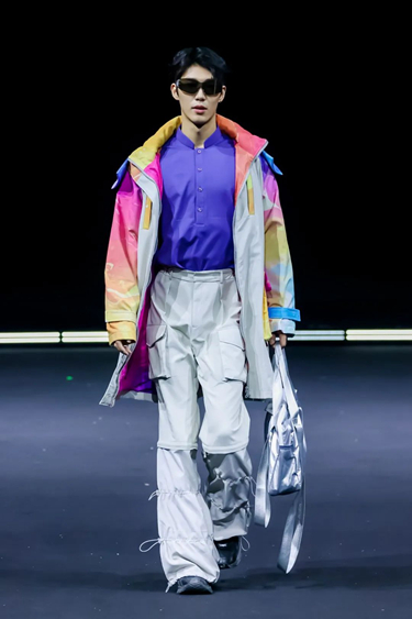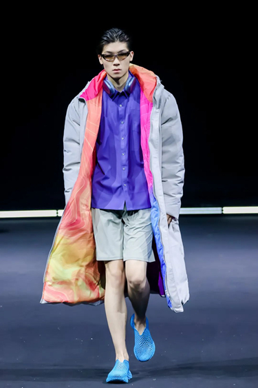 參與此次秀的男裝設(shè)計(jì)方向2020級(jí)王荃介紹,她的系列服裝設(shè)計(jì)主題為“城市探索者”。隨著城市化進(jìn)程的加快,人們的生活方式和消費(fèi)習(xí)慣也發(fā)生著深刻變化,戶外活動(dòng)成為休閑娛樂(lè)、親近自然的重要途徑,城市戶外男裝的設(shè)計(jì)成為備受關(guān)注的話題。她的設(shè)計(jì)具有鮮明的城市元素,兼具戶外服裝的功能性,圖案設(shè)計(jì)靈感來(lái)源于流體畫(huà),色彩搭配參考了水彩畫(huà)的暈染效果。
