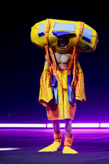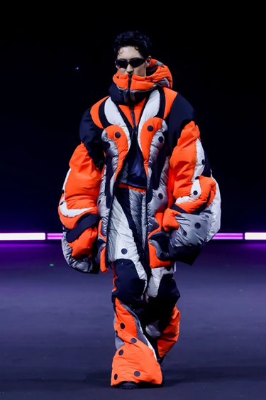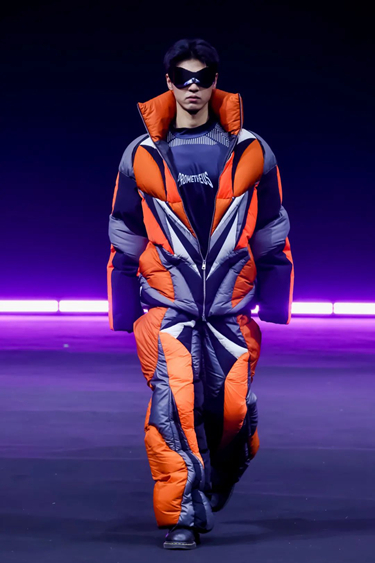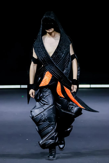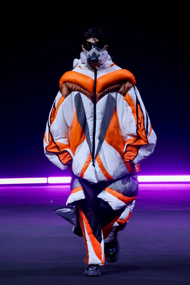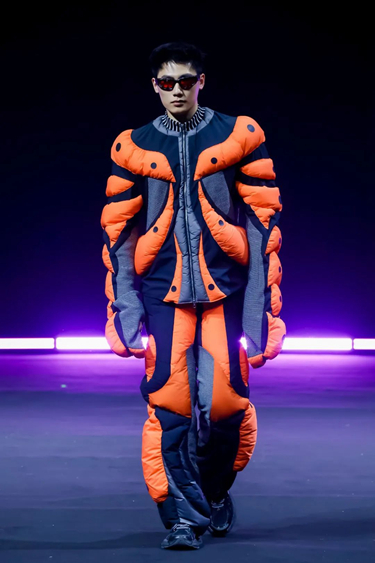 男裝設(shè)計(jì)方向2020級(jí)強(qiáng)煒宸的作品主題為“普羅米修斯”,靈感源于電影《異形》。服裝使用大量撞色拼接填充,極具未來(lái)感及視覺(jué)張力。