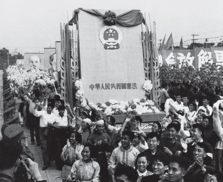 1954年國(guó)慶節(jié),游行群眾抬著《中華人民共和國(guó)憲法》模型通過(guò)天安門