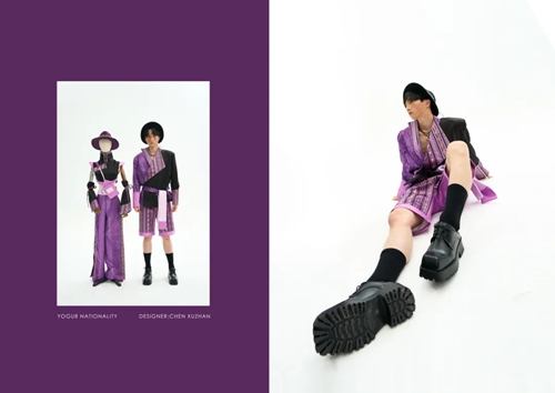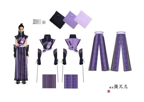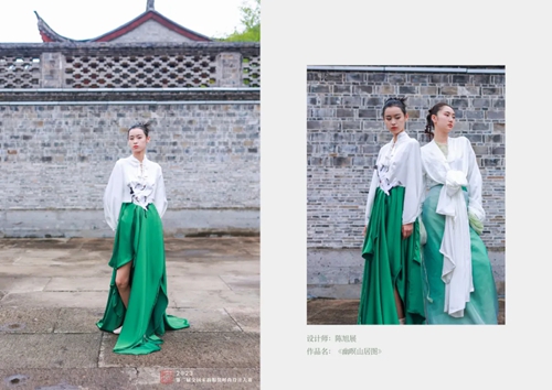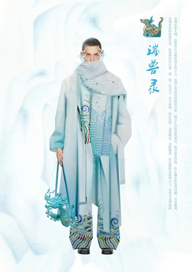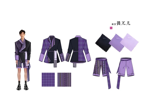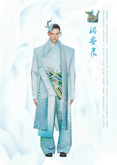 研一上學期,陳旭展在恭王府博物館接觸到實物龍袍和清代織錦繡技藝,導師王羿詳細耐心的講解讓他獲得很多服飾方面知識,這是他與中軸線上服飾文化的“初次會面”。在“清代染織繡”拍賣專場,得以近距離觀看清代織物以及服裝服飾實物,陳旭展深入領會有關文化并在比賽中踐行理論與設計相結合的理念。“也感謝王薇老師組織服裝服飾子賽道服裝組的作品征集工作,有機會讓設計師在中軸線賽道上綻放光彩。”陳旭展談到,老師們的無私幫助,使他擁有了源源不竭的前進力量。