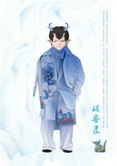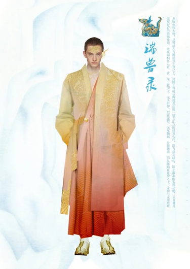 參與北京中軸線文化遺產傳承與創新大賽的作品《紫禁城異獸錄》中,突出的“色彩感受”便是提取于紫禁城典型色彩語言。陳旭展從設計師角度出發,探究文化遺產中能夠和設計產品及藝術作品相結合的部分,把中軸線文化元素、文化基因注入設計作品。“‘傳承’二字,先有‘傳’才有‘承’。要感謝文化遺產研究者對不余遺力的保護、修復和研究,讓文化遺產有‘承’的可能。” 陳旭展曾經參加北服的中國古代裝束復原課程,課程旨在通過對中國古代服裝的形象與技術復原實踐,再現傳統服裝文化的整體風貌,“我參與了北齊徐顯秀墓主人夫婦服飾的復原工作,墓主人頭戴折上巾,身披銀鼠裘皮大衣,穿紅色右衽交領長袍,內搭白色圓領衫,下穿圓頭靴,并系黑色革帶。夫人則頭梳月牙形高髻,右高左低,內著淺色圓領衫,外穿大紅色交領襦裙,裙長及胸,領與袖子的邊沿飾花卉圖案,裙子白色部位飾四瓣花卉紋。” 服飾作為中華優秀傳統文化中的重要文化符號,體現了國人的審美觀念,蘊含了豐富的美學元素,讓陳旭展深深流連、沉醉不已。