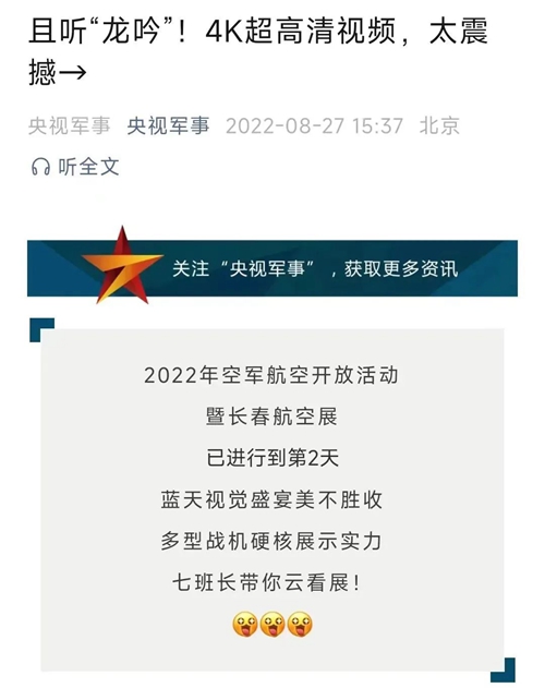 2022年8月27日,“央視軍事”公眾號發(fā)布的專題報道《且聽“龍吟”!4K超高清視頻,太震撼→》,再次將謝集瀟作品推向公眾視野,壯美的影像使更多人感受到航天的力量與美、科技的發(fā)展與震撼。