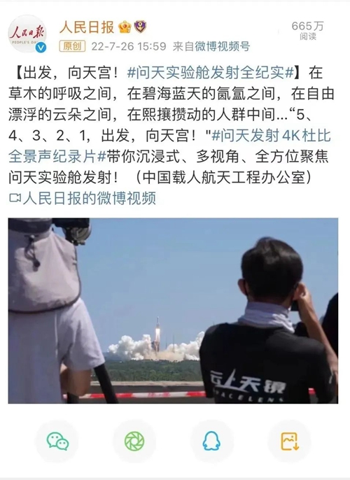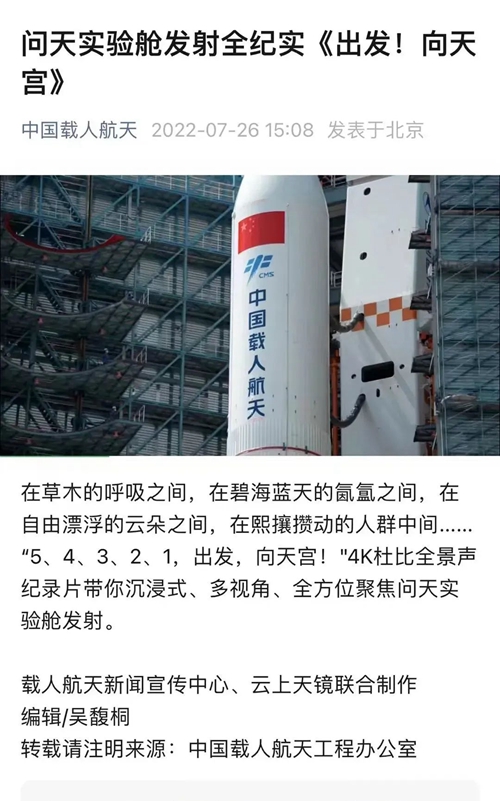 2022年7月26日,謝集瀟團(tuán)隊與中國載人航天工程辦公室合作,制作《出發(fā)!向天宮》全紀(jì)實影片,沉浸式、多視角、全方位聚焦問天實驗艙發(fā)射,讓公眾更加了解航天員的太空之旅。