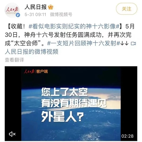 拍攝的神舟十六號載人飛船影像在人民日報微博及客戶端發(fā)布