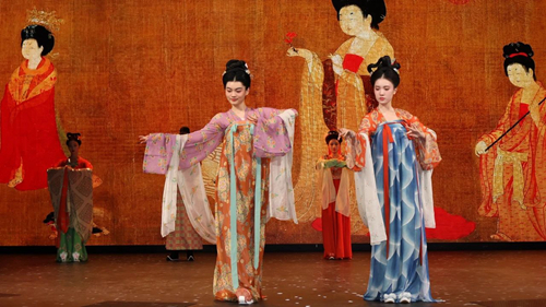 服裝秀開場前,四名志愿者身著唐代復原服飾,賓客近距離欣賞傳統服飾工藝,在形制、色彩、紋樣中體會傳統服飾文化之美;結合現場互動環節,增強賓客參與感、體驗感,使其沉浸于敦煌文化的獨特魅力之中。