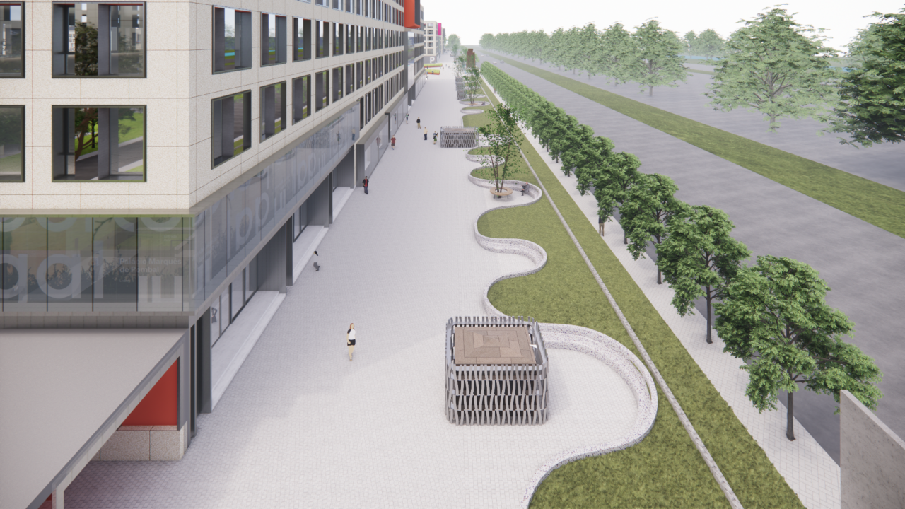 設計說明:格柵排列如若衣裳紋理,波浪紋隱喻通州運河與新校區"時尚長河"的文化流向。