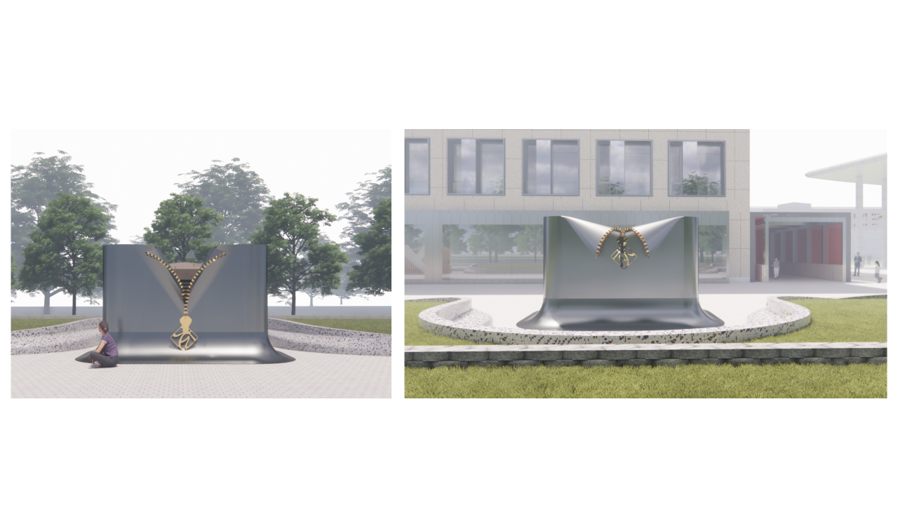 設計說明:造型若石,孔洞聽風,可供“呼吸”;伸縮縫設計為波浪形曲線,模擬服裝裁片的拼接痕跡。