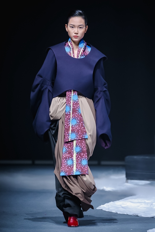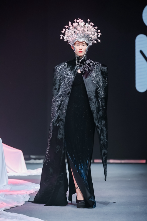 "未"作為生長容器核心理念貫穿全場,舞臺通過非對稱幾何結構與參數化燈光系統,創造出虛實交織的場域。冷調藍白光效中懸浮的立體剪裁作品,與黑色篇章里剛柔并濟的機能風設計形成戲劇張力,在低飽和度暖光中定格為開放式的未完成狀態,完整呈現"從解構到重構"的設計哲學。