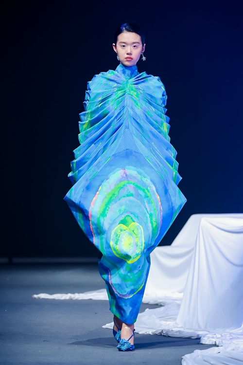 終章以參數化印花與生物基材質的創新組合收尾,漸變光效中流動的數字化紋樣,與植物染工藝的精準色彩控制形成技術對話,構建出開放式的未來時尚圖景。