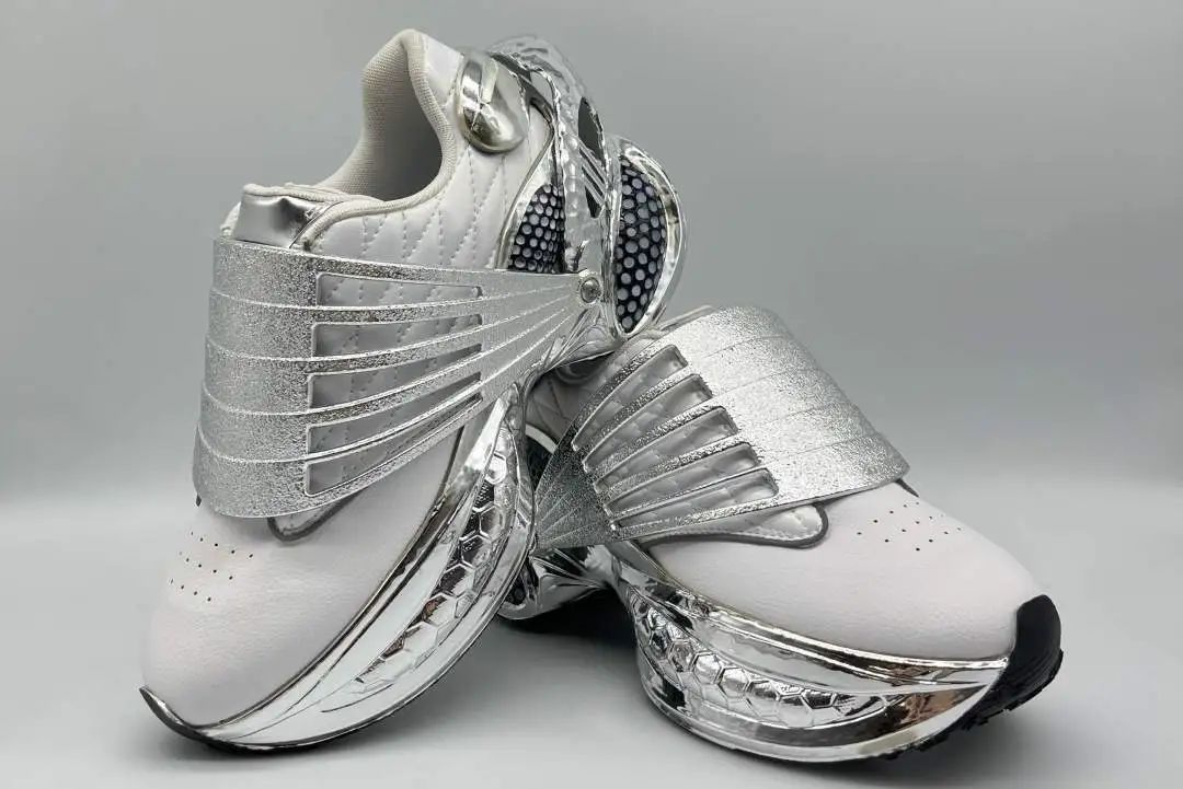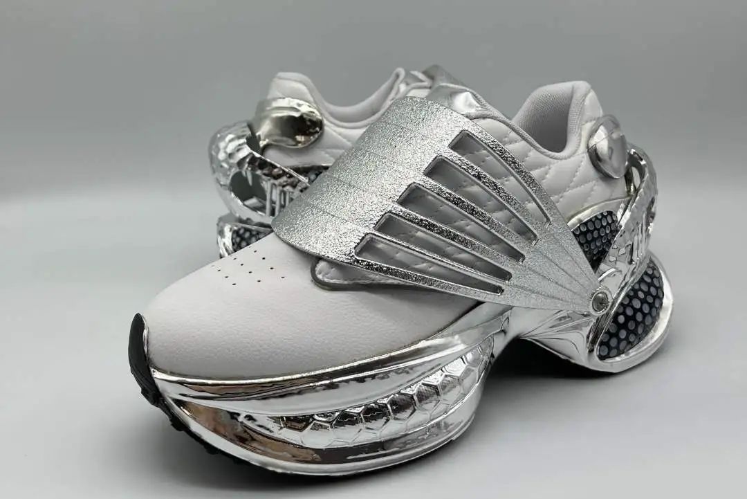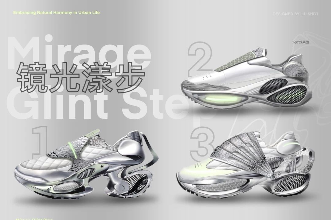 設(shè)計(jì)說明:本系列以“鏡光漾步”為主題,探索光與影、自然與現(xiàn)代的和諧共存,為穿著者提供都市與自然間輕松漫步的體驗(yàn)。設(shè)計(jì)采用高反光材質(zhì),模擬光線在水面的流動,兼具科技感與自然美。色彩融合城市現(xiàn)代感與自然景觀,營造輕松視覺。細(xì)節(jié)注重流暢線條與動態(tài)美,從鞋舌曲線到鞋底紋理,兼顧功能性與藝術(shù)感。該系列不僅是對時尚的探索,更是對都市中自然元素的致敬。