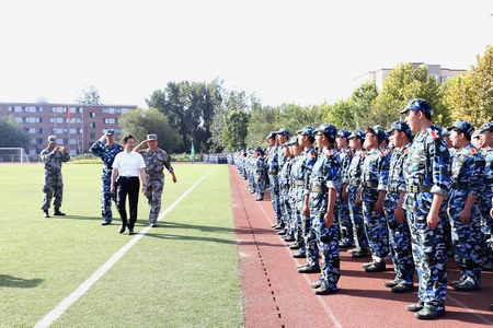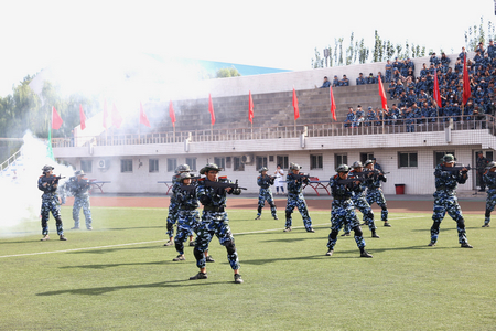 大會在隆重的國歌聲中拉開序幕,劉元風院長在承訓團團長李保華教官的陪同下檢閱了學生方陣。隨后,2016級1397名新生們組成的13個方陣進行了分列式表演,向全院師生展示了十二天的訓練成果。伴著歡呼聲,一支支方隊踏著矯健的步伐,以昂揚的士氣邁步走過主席臺,逐一接受學校領導和承訓部隊首長的檢閱。特訓營作為代表在全體師生面前展示軍人的擒敵拳、端槍表演、火圈表演、戰術與刺殺操等,飽滿的熱情和颯爽的英姿博得了眾人的喝彩。在精彩絕倫的特訓營表演后,英姿勃發的北服學子組成的軍體拳表演方陣,以規范的動作、抖擻的精神充分展現了我校師生團結進取、積極向上的良好精神風貌,贏得了現場師生經久不息的熱烈掌聲。