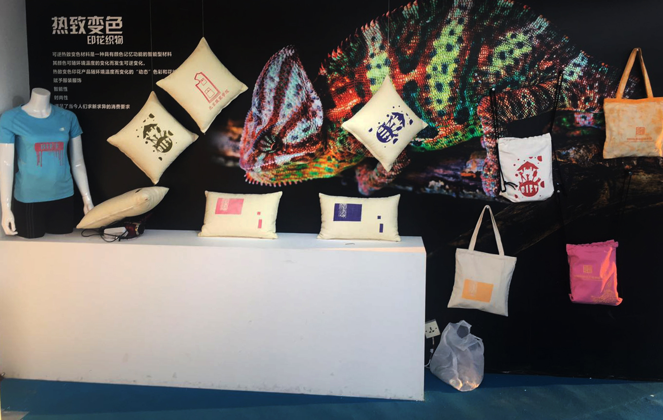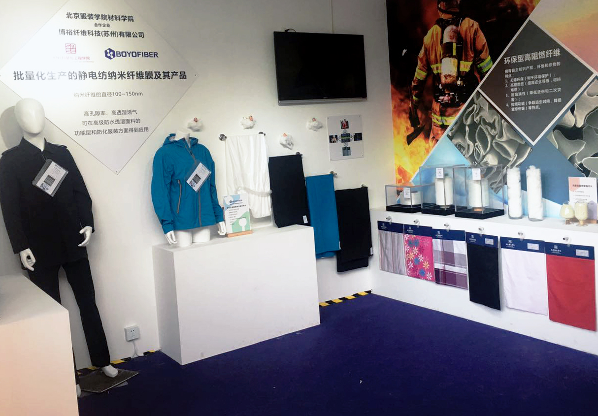 “智能材料”展區展示針對空氣污染防護的過濾纖維及自主研發的空氣過濾裝置、日常防護用口罩,新型電致變色窗,柔性變色服裝和紡織品;“功能纖維和綠色纖維”展區包括擁有自主知識產權的環保型高阻燃纖維,靜電紡納米纖維膜、面料、防水透濕服裝及性能展示,廢舊紡織品循環利用技術和產品展示;“染整工程”展區中,數碼印花無需制版,設計樣稿可在計算機上任意修改。現場可轉印圖案,即時體驗和互動;“智能生活”展區展品為功能機器人、炫彩視覺、可穿戴功能服裝、創意生活家居作品等;“虛擬服裝”展區將體感交互技術應用于試衣系統,使人感受到計算機交互技術發展帶來的便利。