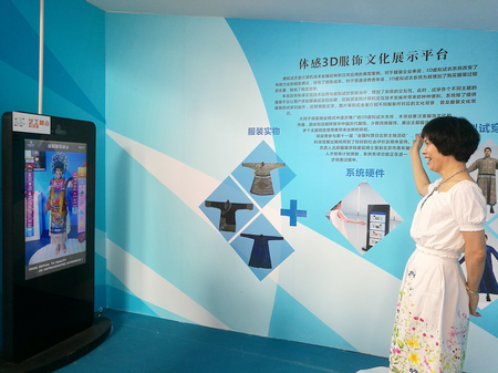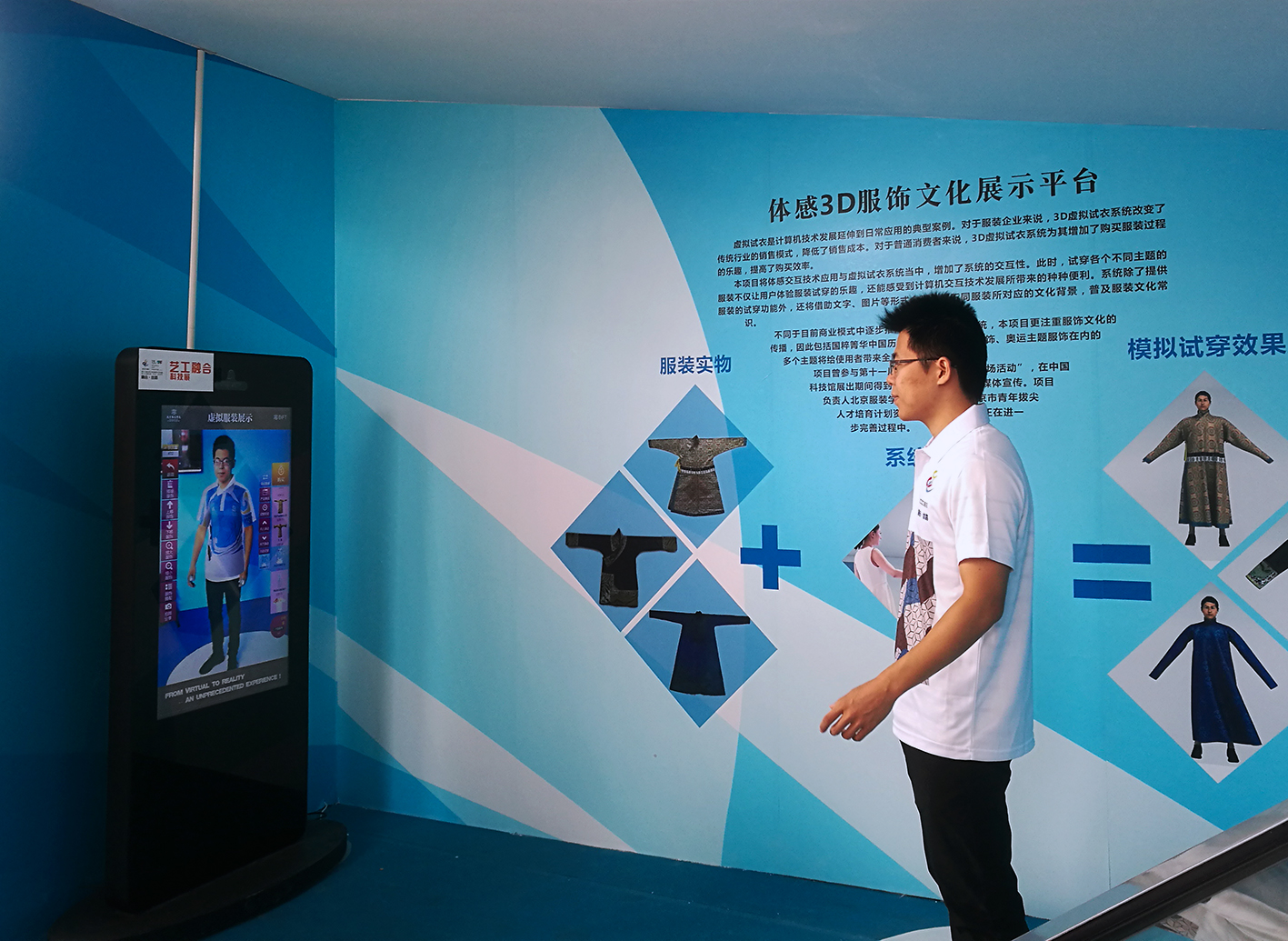其中,在所有產品展示區中,體感3D服飾文化展示平臺最受歡迎。3D虛擬試衣系統除提供服裝的試穿功能外,還借助文字、圖片等形式全面介紹不同服裝所對應的文化背景,普及服裝文化常識。不同于目前商業模式中逐步推廣的3D虛擬試衣系統,本項目更注重服飾文化的傳播,因此包括國粹箐華中國歷代服飾、少數民族服飾、奧運主題服飾在內的多個主題將都給使用者帶來全新的體驗。