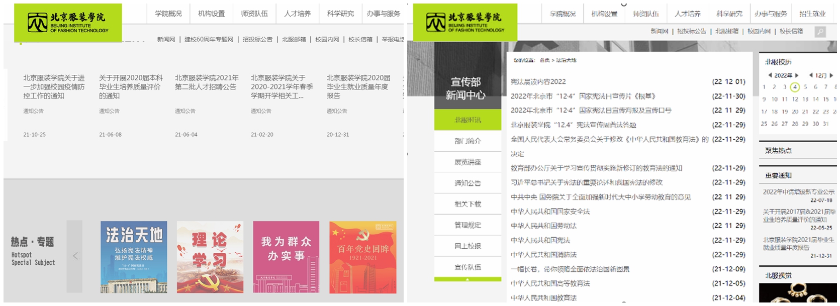 學校統籌做好憲法宣傳周活動和疫情防控相關工作,開展了多種形式的線上憲法學習和宣傳,黨委宣傳部圍繞學習宣傳黨的二十大精神及習近平總書記法治重要論述、《憲法》《民法典》等內容,精心設計問答題開展線上普法答題活動;黨委學生工作部會同北校區組織學生參加全國學生“學憲法 講憲法”網上學習活動和“憲法小衛士”行動計劃,截止目前共有三千八百余名學生參與活動;二級學院通過組織學生設計憲法宣傳海報、召開線上主題班會等形式開展法律知識的學習;黨委教師工作部在學習通APP“北京服裝學院人才發展平臺”上設置“法治教育專題”欄目,面向全校教職工開展“法治教育課程”學習,將學時作為繼續教育學時記錄在學習通系統里;各二級黨組織把黨的二十大精神和憲法學習作為主題黨日內容以線上或自學的方式開展學習。
