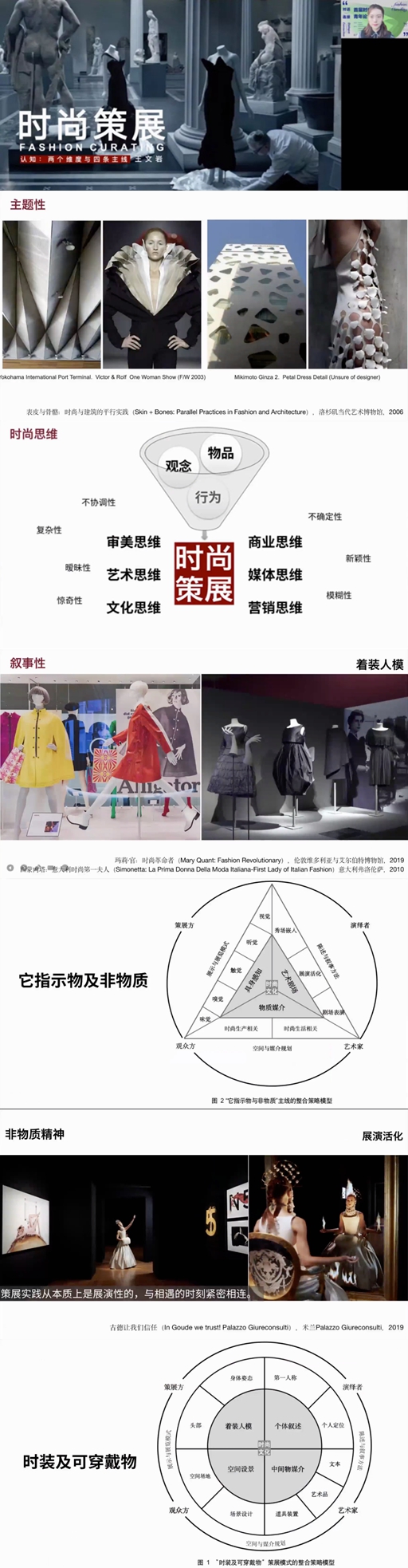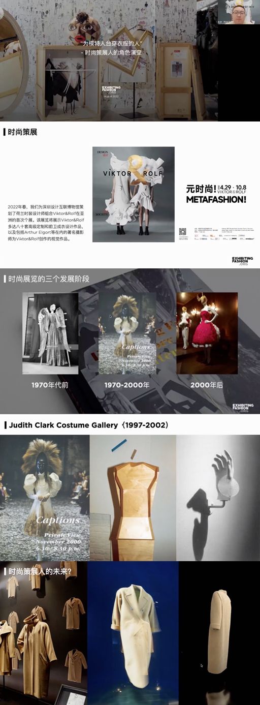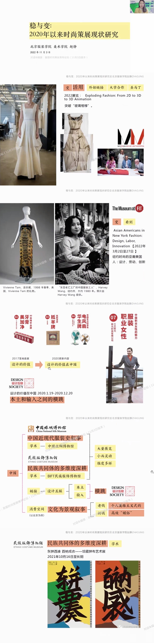 最后一位演講者是北京服裝學(xué)院美術(shù)學(xué)院副教授趙靜,發(fā)表了《穩(wěn)與變:疫情以來(2020-)時(shí)尚策展現(xiàn)狀研究》的主題演講,她從全球博物館的時(shí)尚策展案例的類型分析切入,表達(dá)了她對(duì)于展覽案例在文化視域下的觀察;分析了作為全球時(shí)尚資源的一種調(diào)度與管理方式,時(shí)尚策展如何成為文化敘事的方式之一;對(duì)比了博物館與商場(chǎng)中的時(shí)尚文化表達(dá)有何不同?以及在內(nèi)容的在地和資源的求變中,博物館又可以多大程度上在“穩(wěn)”與“變”中博弈。