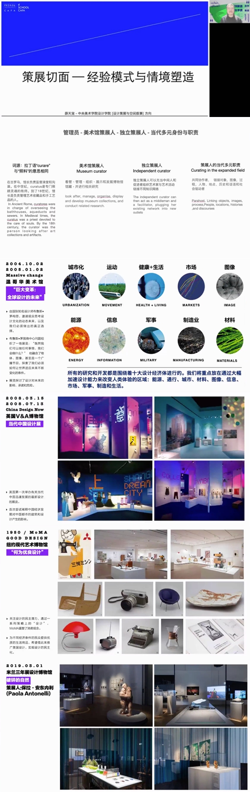 接下來的演講者是中央美術(shù)學(xué)院設(shè)計(jì)學(xué)院的薛天寵老師,作為央美設(shè)計(jì)策展與空間敘事專業(yè)方向召集人和設(shè)計(jì)學(xué)院展覽部負(fù)責(zé)人,為大家?guī)砹恕恫哒骨忻?——經(jīng)驗(yàn)?zāi)J脚c情境塑造》的主題演講。薛老師介紹了央美設(shè)計(jì)策展的課程框架,以及策展人在當(dāng)代的多元職責(zé),提出策展人應(yīng)該:“視野全球,著眼于中國文化語境,為設(shè)計(jì)策展實(shí)踐提供理論模型,為設(shè)計(jì)學(xué)科中策展模式提供路徑與方法。以設(shè)計(jì)策展推動(dòng)、補(bǔ)充中國學(xué)界中設(shè)計(jì)批評(píng)、設(shè)計(jì)收藏、設(shè)計(jì)博物館建設(shè)、設(shè)計(jì)策展教學(xué)、等內(nèi)容,構(gòu)建話語體系。”他還以當(dāng)代藝術(shù)、設(shè)計(jì)發(fā)展流變?yōu)榛A(chǔ),結(jié)合展覽史和研究已有展覽模式,對(duì)策展實(shí)踐的多種可能性進(jìn)行探討。
