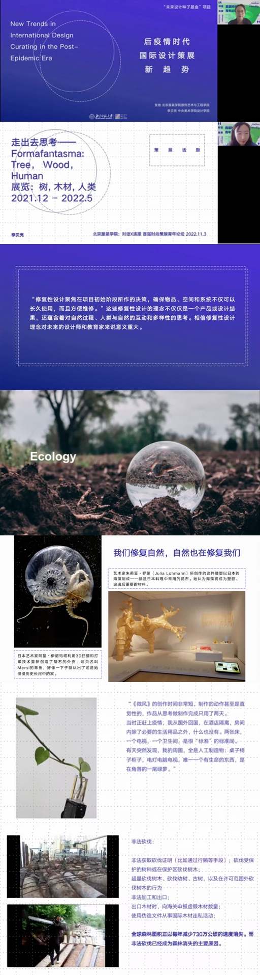 第二個(gè)演講主題是《后疫情時(shí)代國際設(shè)計(jì)策展新趨勢(shì)》,由北京服裝學(xué)院服飾藝術(shù)與工程學(xué)院助理教授張弛和中央美術(shù)學(xué)院設(shè)計(jì)學(xué)院設(shè)計(jì)策展方向教師李貝殼共同完成。她們以共同合作的研究成果為基礎(chǔ)展開,通過聚焦海外知名設(shè)計(jì)博物館最近三年以來的主要展覽,討論了在博物館的語境之下,后疫情時(shí)代的設(shè)計(jì)與設(shè)計(jì)策展所產(chǎn)生的新變化,并反思當(dāng)代設(shè)計(jì)在后疫情時(shí)代應(yīng)承擔(dān)的角色及責(zé)任。