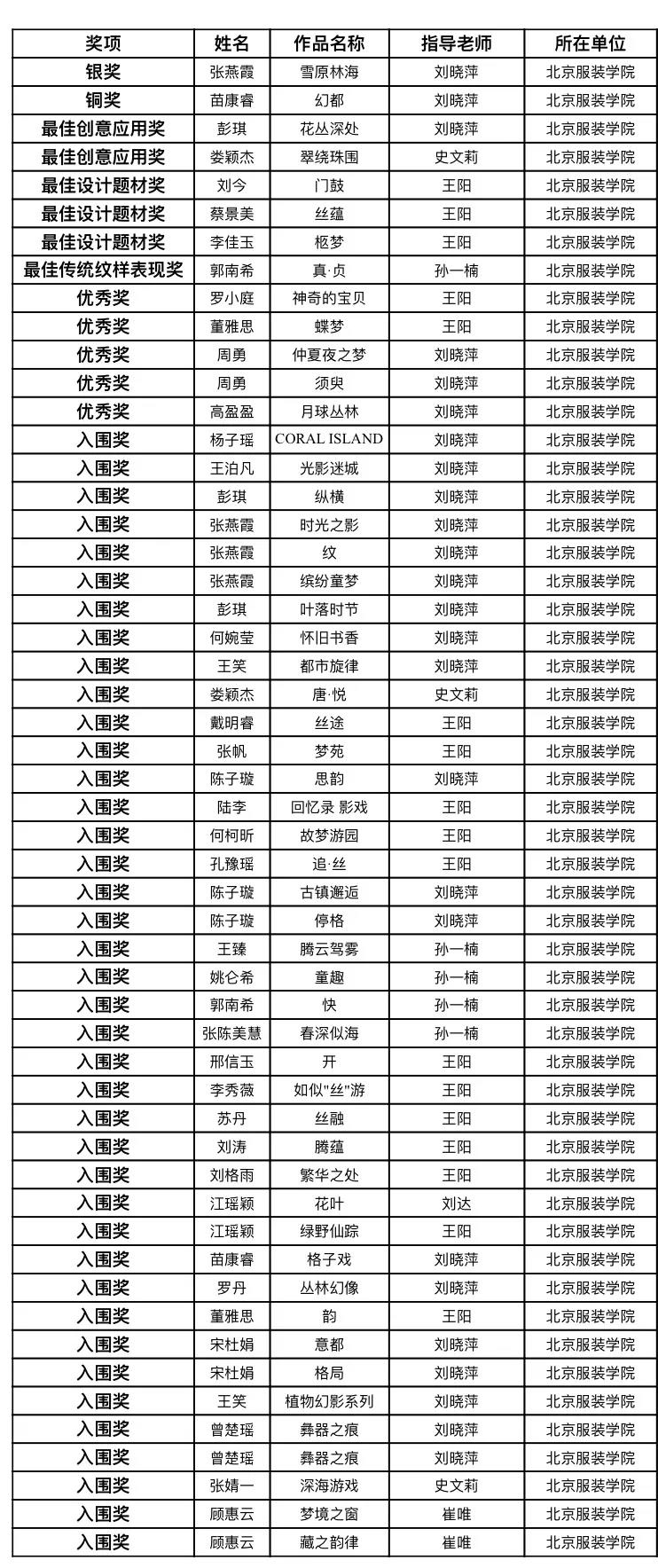 本屆大賽中,我校紡織品設計專業老師帶領學生參賽,摘取碩果累累,共獲得銀獎1項,銅獎1項,最佳創意應用獎2項,最佳傳統紋樣表現獎1項,最佳題材獎3項,優秀獎3項,入圍獎多項。紡織品專業教師、研究生導師劉曉萍,紡織品專業教師、研究生導師史文莉,紡織品專業教師王陽,獲得了優秀指導教師稱號。北京服裝學院獲得優秀組織獎。
