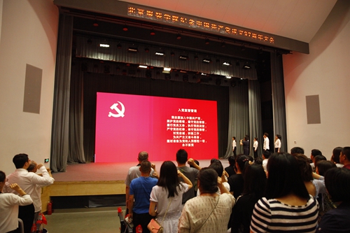 在七一前夕,我校黨員、黨組織紛紛想向黨說句心里話,大會以視頻形式展示了這些黨員的心里話。他們中有我校黨齡最長的老院長劉沖,有我校年齡最小的、剛剛度過十九歲生日的王苡霖,有我校發展的第一名新疆籍哈薩克族學生黨員巴扎爾古麗·哈冷木哈孜,有榮獲畢業十星之黨建之星的畢業生黨員高瑞濤,有中國十佳服裝設計師、教師黨員楚艷,有默默耕耘在教輔一線的教工黨員賈永春,有膳食科黨員教工高愛民,還有來自我校長三角時尚產業園功能型黨支部在晨風的問候。最后,全體黨員在2018年優秀黨務工作者陳廣恩老師的帶領重溫入黨誓詞。“我志愿加入中國共產黨”的聲音久久響徹禮堂。最后,在集體齊唱《沒有共產黨就沒有新中國》的雄壯歌聲中,北京服裝學院慶祝建黨九十七周年大會勝利閉幕。
