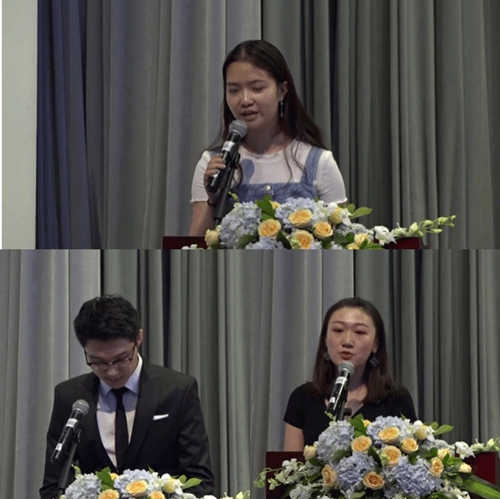 典禮即將進入尾聲時,由北京服裝學院學生處處長張宏娜宣讀了新生入學獎學金的獲獎名單。一共有23位同學們獲得了獎學金,其中曹翰、王一彤、郭云嘉、王晴、溫可馨分別以高考英語130分以上或雅思6.0分以上獲得新生入學獎學金5000元。張處長表示,希望在座的每位同學都勤奮學習,不斷取得好的成績,順利實現留學夢想!