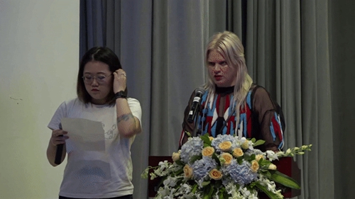 北京服裝學院國際本科2018級數字媒體設計專業新生王野、服裝設計專業新生吳倩作為本次典禮新生代表進行了發言。他們滿懷著對大學新生活的憧憬,用鏗鏘有力的聲調表述了對學好核心專業課程的決心,并且要充分利用好圖書館計算機和互聯網這些資源,積極培養自己獨立思考和探索的能力。希望和同學們一起,用年輕的汗水去澆灌青春的夢想之花,以奮斗迎接光明,用微笑對待生活。