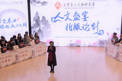 首先,思想政治理論課教學部主任張紅玲致辭,她表示,我校大學生人文知識競賽已經是第七屆了,每屆都在不斷進步和完善,希望同學們以競賽為契機,自覺學習人文知識,提高人文素養,借競賽這一平臺,展現北服學子的人文底蘊和人文情懷。本屆比賽經初賽筆試選拔,共有40位同學脫穎而出,他們以院系為單位組成8支隊伍參加決賽。本屆決賽題型豐富,分為團隊介紹、搶答題、快速答題、搶答典故、猜詞題和人文演繹六個環節。