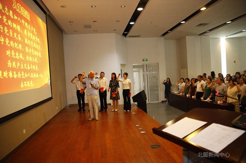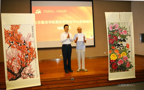 接下來,黨委書記馬勝杰宣讀了黨委常委會關(guān)于接收谷守山同志為預備黨員的決議,并為谷守山同志佩戴黨徽。我校退休教授谷守山老師,1938年出生,1962年中央工藝美院畢業(yè)后響應黨和國家號召,志愿去新疆工作,并于同年寫下了第一份入黨申請書,在新疆一待就是三十年,無論順境逆境,谷老都始終以一名黨員的標準要求自己。2017年5月20日,七十八歲高齡的谷老再次遞交入黨申請書,表達了想加入黨組織,迫切地為黨和人民做點事的愿望。6月25日,校黨委常委會討論通過關(guān)于接收谷老師入黨的決議。谷老在發(fā)言中回顧了自己畢生追求入黨、追求為人民服務的人生經(jīng)歷,誠懇地表達出想繼續(xù)為黨和人民做點事的渴望和決心,谷老還為建國七十周年和建校六十周年創(chuàng)作了兩幅畫作現(xiàn)場捐給學校,在座的黨員同志深深地被老藝術(shù)家的精神所打動。