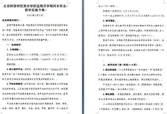 保證數千名師生正常教學的背后,是長達三周的積極籌備。1月28日,學校發布《關于北京服裝學院2020年春季學期延期開學工作方案》,美術學院當即成立了線上教學專項小組,啟動延期開學相關教學工作:整合課程、調整課表、平臺測試等,于2月3日制定完成了《美術學院2020年春季學期延期開學期間教學方案》。