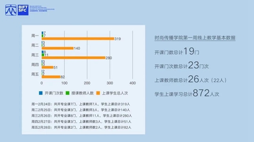 綜合第一周線上教學的整體情況,無論是教師當日反饋、校院兩級督導反饋,還是通過調查問卷,聽課學生的反饋,均顯示出學生極高的學習熱情。一周各專業所有課程的正點出勤率、到課率均為100%,還有多門課程,聽課的學生人數大大超過了應到課的學生人數,反映出學生對網絡優質課程的熱情。第一周線上教學的順利開展為本學期教學工作奠定了良好基礎,后續工作中,時尚傳播學院將在鞏固現有成果的基礎上,繼續開拓進取,不斷改進,爭取更大的進步。