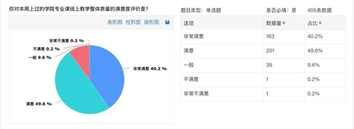 一周的線上教學完成后,學院及時開展了學生滿意度調查活動。調查數據顯示,學生對專業課教師的線上教學水平非常滿意和滿意為95.8%,對學院專業課線上教學整體質量非常滿意和滿意為89.9%。