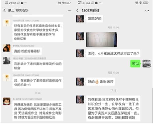 上午半天理論講解,為了鞏固學(xué)習(xí)效果與加強(qiáng)對課堂的管理,要求學(xué)生當(dāng)天提交一部分作業(yè)。下午四節(jié)課學(xué)生要對照學(xué)習(xí)資料完成作業(yè),有問題可以隨時在學(xué)習(xí)通、微信群里提問,老師們答疑。周三我和張繼紅老師同時開課,留了四張裙子結(jié)構(gòu)圖的練習(xí)。當(dāng)天晚上,兩個班120多名同學(xué)的作業(yè)就全部交齊。