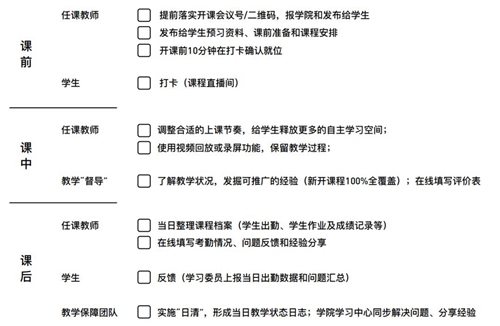 根據在線課程運行的特點,張倩老師面向所有開課教師和教學管理團隊規范了在線教學的“動作”和節奏,師生已經形成良好的“課前準備-上課打卡-課間督導-結課匯報”的教學管理和運行節奏。四周以來,在線教學運行順暢,達到了預期的教學效果。