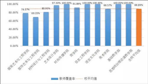 教師覆蓋率是指學生評價覆蓋到的教師人數與開課教師總人數之比。該數據可以作為各教學部門教學組織情況的參考視角之一。數據顯示,全校教師覆蓋率為88.89%。具體到11個部門教學中,有7個部門教師覆蓋率超過90%,其中5個部門為100%,說明這些部門對本次學生評教非常重視,克服不利因素,組織工作十分優秀;所有部門的教師覆蓋率均超過67%,說明各部門被評價教師人數均超過了開課教師總人數的三分之二,評價結果基本可以反映該部門的教學整體狀況(見圖1)。