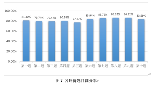 從10道評價題目得分的滿分占比情況來看,滿分率基本徘徊在70%-90%之間,以80%-90%為主(見圖7)。其中,后5題(對教師的評價)的滿分率明顯高于前5題(對課程的評價),說明在引導學生對課程的重視和學習方面,教師還有提升空間。各題得分的具體分布見圖8。