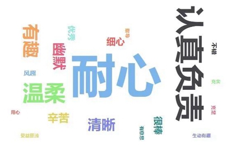 在對教師線上教學的總體評價中,表示滿意的學生占比高達94.33%(其中非常滿意為68.57%,滿意為25.76%),認為不滿意和較差的僅占到1.39%(見圖5)。在學生意見欄中,學生給出了較高評價,根據學生評價詞云圖,認為教師認真負責、有耐心等肯定性詞匯出現頻率較高(見圖6)。以上數據說明了學生對教師線上教學的認可。