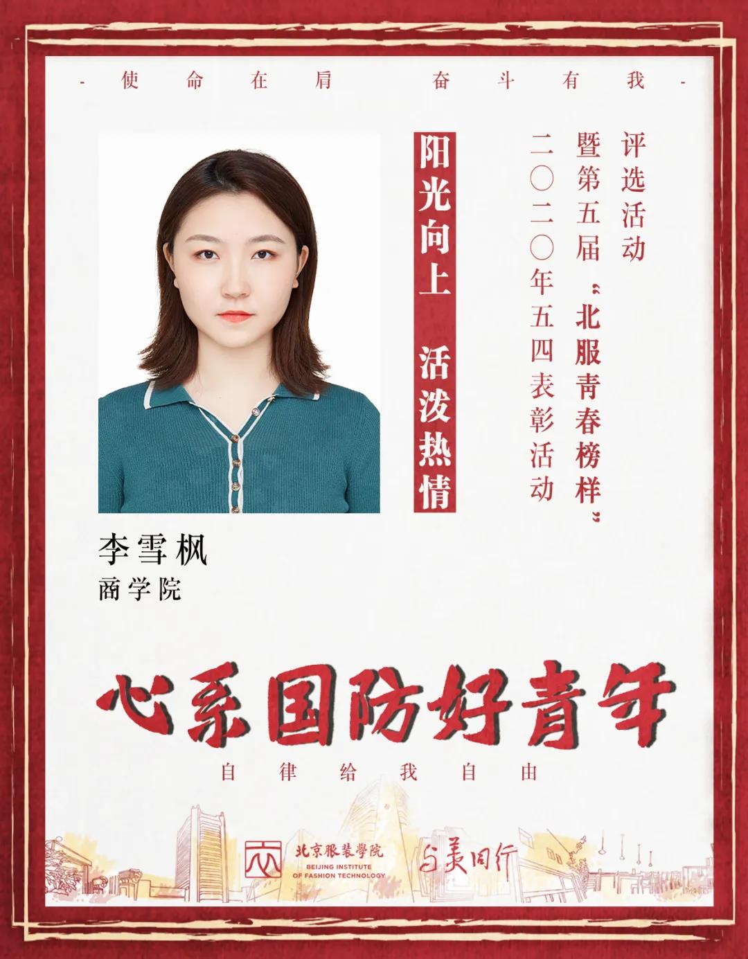 平易近人,謙虛好學(xué)是她待人接物秉承的原則;踏實(shí)認(rèn)真,戒驕戒躁是她處理工作恪守的準(zhǔn)則;積極進(jìn)取,不斷創(chuàng)新是她組織活動(dòng)堅(jiān)持的標(biāo)準(zhǔn)。作為一名北服學(xué)生干部,北京市“優(yōu)秀學(xué)生干部”、北京服裝學(xué)院“優(yōu)秀團(tuán)干部”、70周年群眾游行活動(dòng) “訓(xùn)練之星”以及“先進(jìn)個(gè)人”,斬獲無(wú)數(shù)個(gè)人榮譽(yù)的她始終堅(jiān)守著心中的執(zhí)著,那就是攜手北服青年,共同開(kāi)創(chuàng)更加輝煌的成績(jī),用自己的青春力量書(shū)寫無(wú)愧于這個(gè)時(shí)代的最美頌歌。