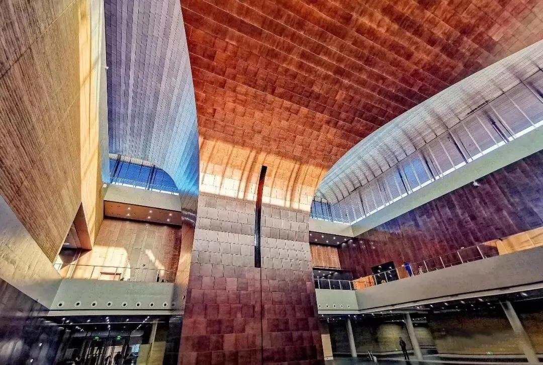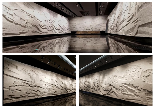 1.序廳空間設計:序廳以“光輝肇始、王朝開端、撥云見日、宏基華夏”主題雕塑為起始,追求史詩般的宏大氛圍,著重表現二里頭遺址在夏王朝考古探索歷程中的重要地位。頂部設計巨耒造型,構成空間的發散性和向心性,暗喻二里頭文化的吸收與輻射,同時營造序廳王朝氣象的儀式空間。序廳大型花崗石浮雕壁畫《光輝肇始·宏基華夏》作者:馬天羽、胥昌群、李宏、張玉亮。