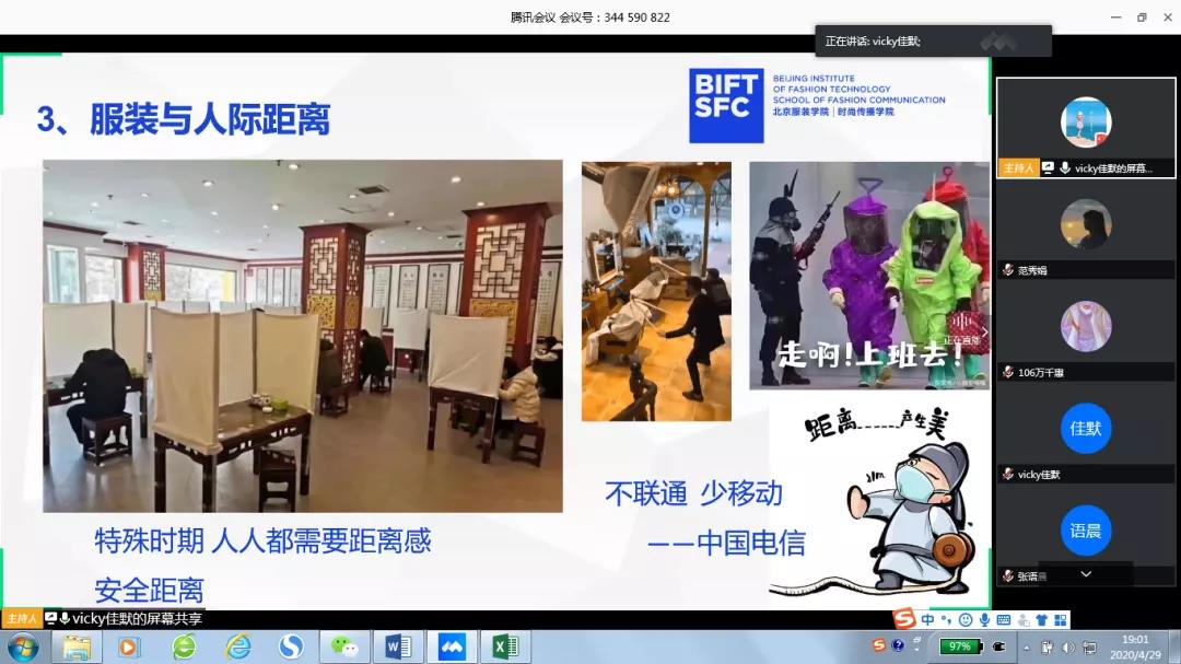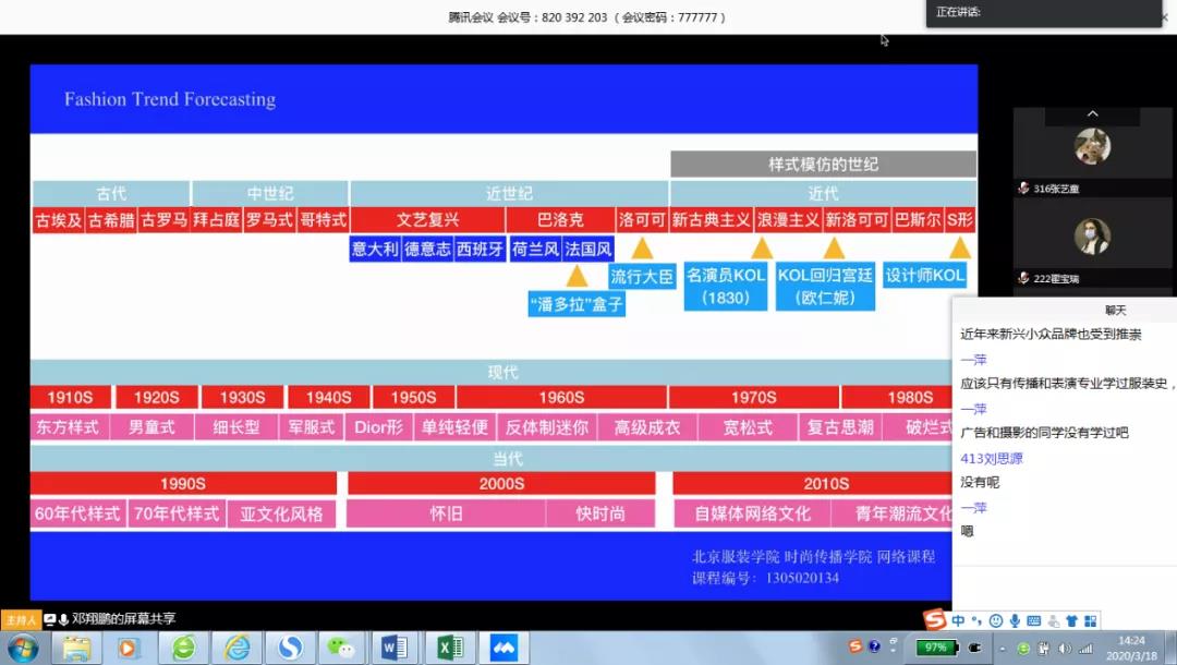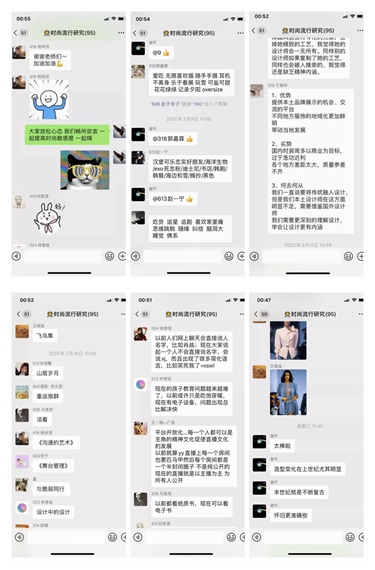 教學(xué)特色:在教學(xué)組織上,課前15分鐘通過平臺播放課程相關(guān)的視頻,引導(dǎo)學(xué)生按時上課,提前進(jìn)入狀態(tài)。課堂中用時間線理清歷史上時尚流行趨勢脈絡(luò),用流行趨勢理論來對接時尚案例,畫龍點睛,抓住時尚流行本質(zhì)。授課中,兩位老師一位講授知識點,一位利用微信群和直播平臺帶動學(xué)生參與溝通,觀察和把控學(xué)生學(xué)習(xí)節(jié)奏。學(xué)生邊聽邊思考、邊學(xué)習(xí)、邊實踐,提升了對知識的認(rèn)知和吸收。課上的交流和互動亦可以隨時調(diào)動網(wǎng)絡(luò)資源,提出概念或問題后,讓學(xué)生們通過匯集網(wǎng)絡(luò)資源實現(xiàn)概念的初步認(rèn)知,引導(dǎo)學(xué)生研究性學(xué)習(xí)。同時,微信群里的互動內(nèi)容成為寶貴的資料庫,有效的擴(kuò)展知識點,形成內(nèi)容上的補充。