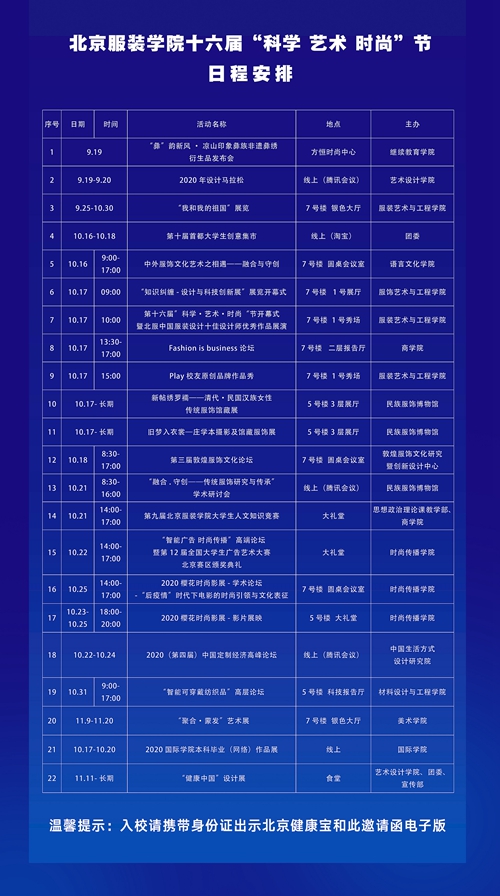北京服裝學(xué)院2020年第十六屆“科學(xué)·藝術(shù)·時(shí)尚”節(jié)定于10月17日(星期六)上午舉行開幕式。