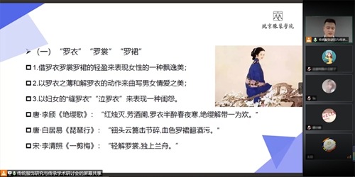 漢魏六朝時期作為我國古代詩歌的逐漸成熟的重要時期,詩歌中有大量描寫服飾形象的意象,演講以該時期詩歌中出現(xiàn)的“羅衣”“長袖”等意象為例進行分析,對其流變做出了論述。演講指出衣冠服飾作為一種重要文化載體,反映了各歷史階段的生活形態(tài),并在文學創(chuàng)作中占據(jù)重要地位。中國傳統(tǒng)服飾文化促進了文學藝術的發(fā)展,同時豐富的中國古代文學遺產為我們研究、了解古代服飾發(fā)展史提供了重要佐證。