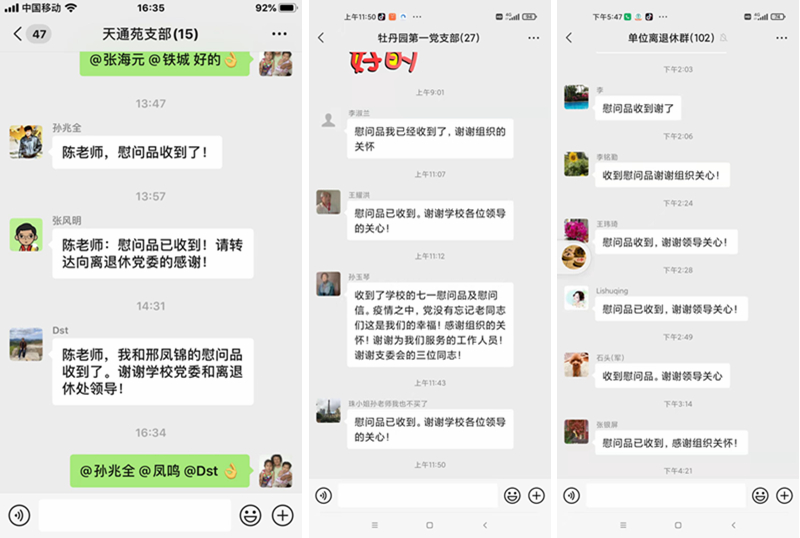 今年的“七一”慰問工作按照京內黨員群眾、京內困難黨員群眾和京外境外黨員群眾分類開展,同期開展了上半年大病困難補助工作、慰問了今年滿整年齡的38位老同志。受疫情影響,今年的七一慰問活動通過網上購物速遞到家以及發放慰問金等方式進行。截止6月底,京內外的所有離退休老師已全部收到慰問品(慰問信)或慰問金,我校七一離退休人員慰問工作實現了全覆蓋。