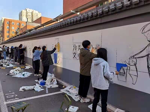 此次墻繪志愿服務活動持續四個多小時,繪制墻面40余米。師生共同創作的垃圾分類宣傳畫躍然“墻”上,不僅成為了社區里一道亮麗的風景線,也為社區新增一處宣傳陣地。