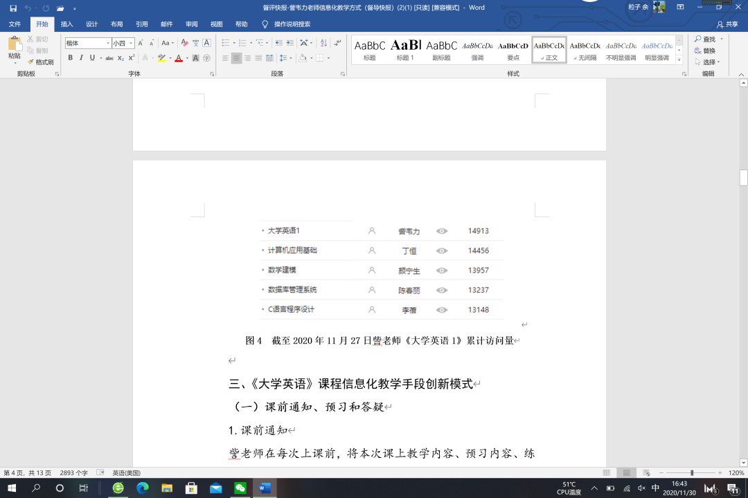 截至2020年11月27日,訾老師的《大學(xué)英語1》課程在線教育綜合平臺累計訪問量達(dá)到14913人次。