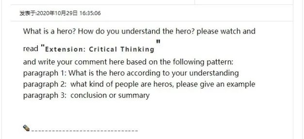 訾老師將作文與課程思政相結(jié)合,以“思想聚焦”的形式呈現(xiàn)。第四單元作文題目是:What is a hero? How do you understand the hero? 同學(xué)完成作文后,在線提交,訾老師在線進(jìn)行批改作文。很多同學(xué)手寫作文,字跡工整,字體非常漂亮。
