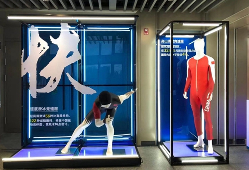 護涉及訓練比賽過程中服裝裝備的保護性能。冬季運動項目速度高、環境復雜,運動員損傷風險較大,主要有沖撞和刺割兩類損傷,多個研發單位聯合攻堅這一課題。在展示的比賽裝備中,高山滑雪訓練防護服采用新型的柱狀陣列式抗沖擊結構和新型吸能緩震材料,為運動員量身定制。能有效保護高山滑雪運動員穿越旗門時的抽打傷害。短道速比賽服則全身使用防切割面料,全面保護運動員身體,同時考慮肌肉壓縮、服裝減阻功能。