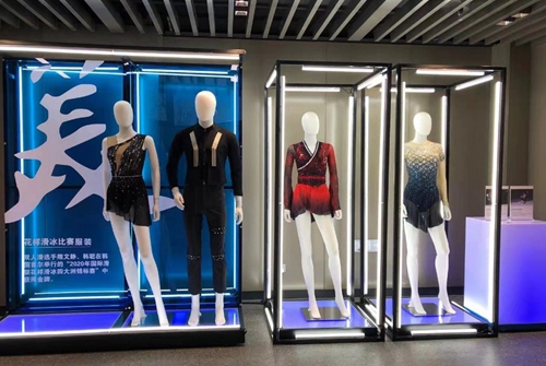 美的展示里呈現了四件花樣滑冰比賽服。每一件衣服都是根據音樂主題、舞蹈設計、融合服裝高級定制元素、按照運動員身體尺寸定制。目前正探索融合中國傳統技法,充分傳達中國文化,展現“四個自信”。